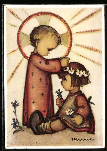 Künstler-AK Hummel: Jesuskind setzt Mädchen einen Blumenkranz auf