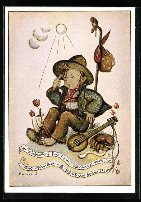 Künstler-AK Hummel: Junge verliert bei seiner Wanderung einen Strumpf
