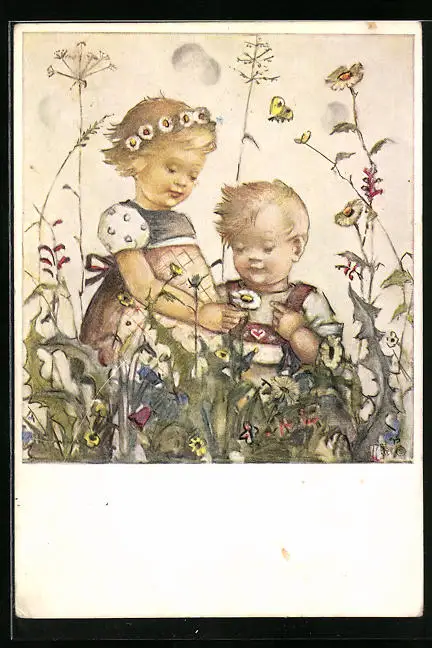 Künstler-AK Hummel: Kinderpaar auf einer Blumenwiese