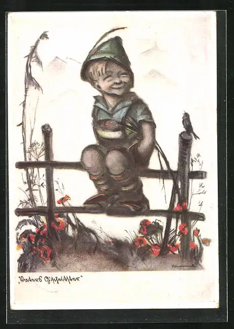 Künstler-AK Hummel: Kleiner Bayer sitzt auf Zaun