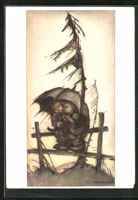 Künstler-AK Hummel: Kleines Paar im Sturm
