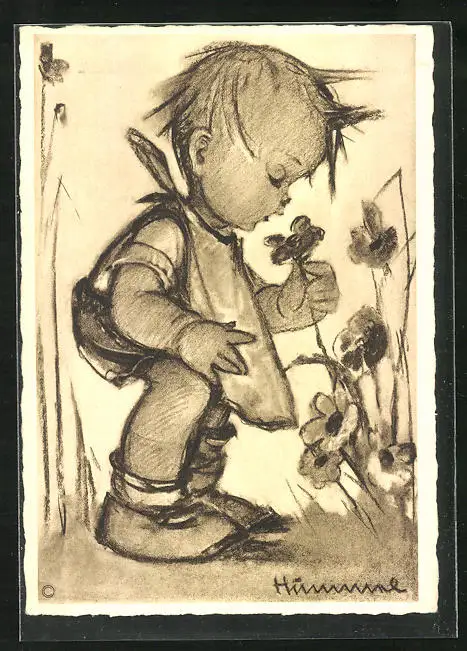 Künstler-AK Hummel: Kleinkind riecht an Blume