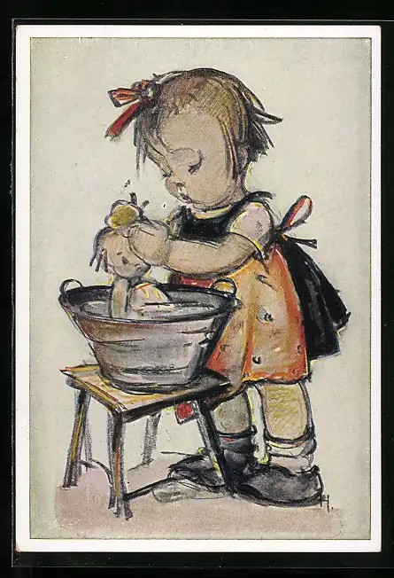 Künstler-AK Hummel: Mädchen badet eine Puppe