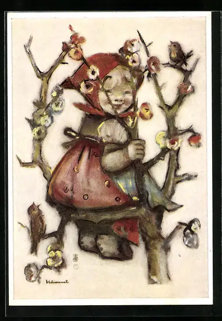 Künstler-AK Hummel: Mädchen sitzt auf Baum mit Vögeln