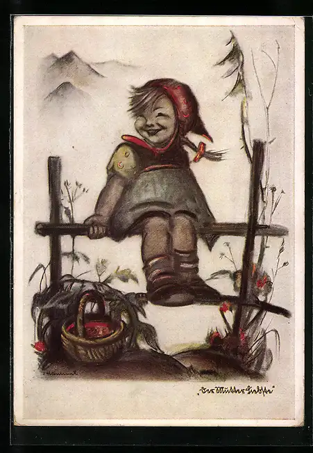 Künstler-AK Hummel: Mädchen sitzt auf dem Zaun