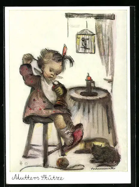 Künstler-AK Hummel: Mädchen stopft einen Strumpf, Mutters Stütze