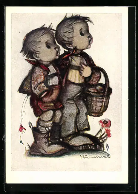 Künstler-AK Hummel: Zwei kleine Jungs mit Körbchen
