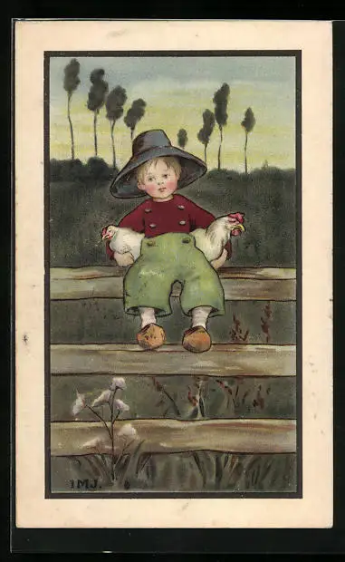 Künstler-AK I.M.J.: Junge mit Hühnern am Zaun