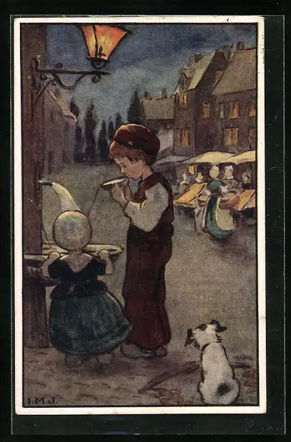 Künstler-AK I.M.J.: Junge mit Mädchen am Trinkbrunnen