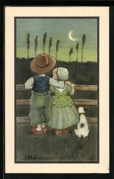 Künstler-AK I.M.J.: Junge umarmt Mädchen bei Mondschein