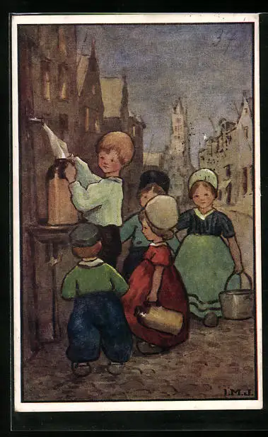 Künstler-AK I.M.J.: Kinder befüllen Gefässe mit Wasser
