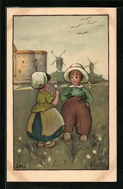 Künstler-AK I.M.J.: Kinder mit Löwenzahn bei den Mühlen