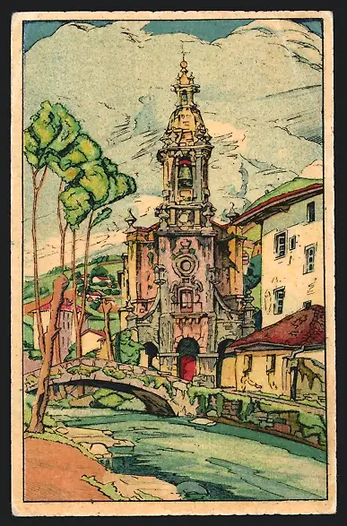 Künstler-AK Ibarra, Ortsansicht mit Kirche und Brücke