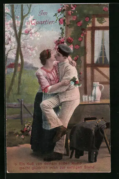 Künstler-AK Im Quartier. - Soldat küsst Geliebte