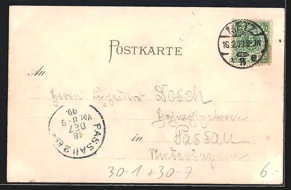 alte Ansichtskarte, gelaufen 1899, Stempelspur, guter Zustand