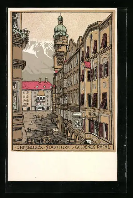 Künstler-AK Innsbruck, Stadtturm, Gasthaus Goldenes Dachl