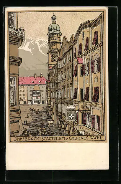 Künstler-AK Innsbruck, Stadtturm, Gasthaus Goldenes Dachl