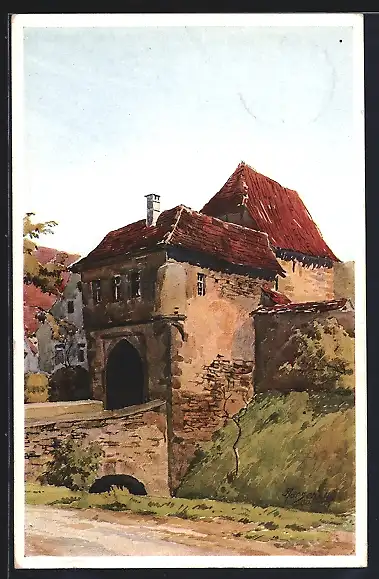 Künstler-AK Iphofen, Mainbernheimer Tor von der Strasse aus