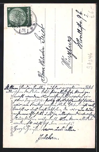 Personenbezogene Daten auf der Rückseite der Karte wurden durch blauen Textmarker unkenntlich gemacht. Die blauen Stellen sind auf die Vorderseite durchgeweicht und wirken sich negativ auf das Postkartenfoto aus