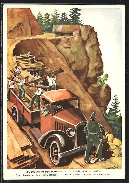 Künstler-AK Irgendwo in der Schweiz, Stop-Bunker an einer Einfallstrasse