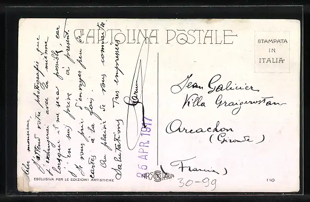 Personenbezogene Daten auf der Rückseite der Karte wurden durch blauen Textmarker unkenntlich gemacht. Die blauen Stellen sind auf die Vorderseite durchgeweicht und wirken sich negativ auf das Postkartenfoto aus