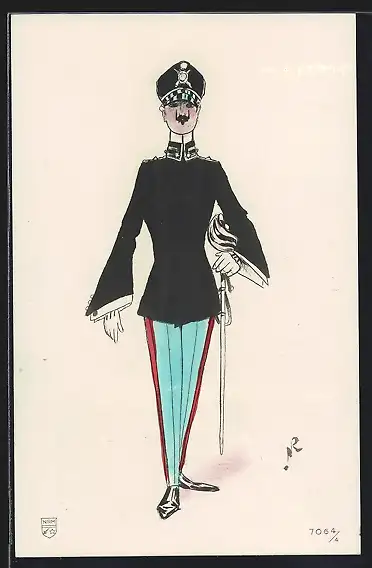 Künstler-AK Italienischer Soldat in Uniform mit blauer Hose und Degen