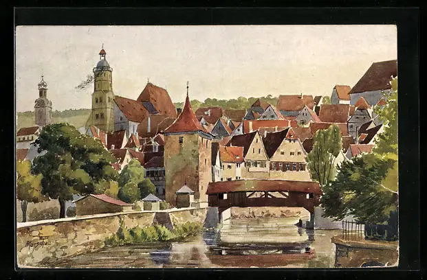 Künstler-AK J. Marschall: Schwäbisch-Hall, Partie am Sulfersteg