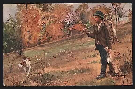 Künstler-AK Jäger kehrt mit Hund und erlegtem Hasen nach Hause zurück