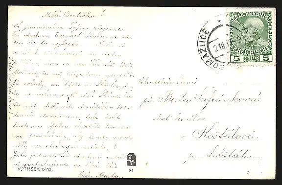 Personenbezogene Daten auf der Rückseite der Karte wurden durch blauen Textmarker unkenntlich gemacht. Die blauen Stellen sind auf die Vorderseite durchgeweicht und wirken sich negativ auf das Postkartenfoto aus