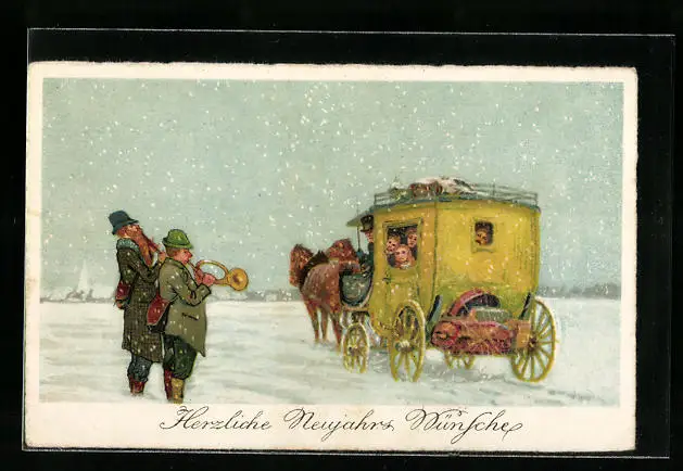 Künstler-AK Jäger stimmen ein Ständchen an, Postkutsche, Neujahrsgruss