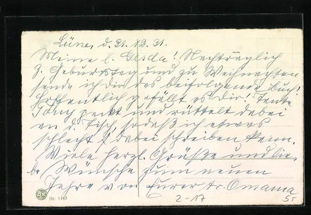 Personenbezogene Daten auf der Rückseite der Karte wurden durch blauen Textmarker unkenntlich gemacht. Die blauen Stellen sind auf die Vorderseite durchgeweicht und wirken sich negativ auf das Postkartenfoto aus