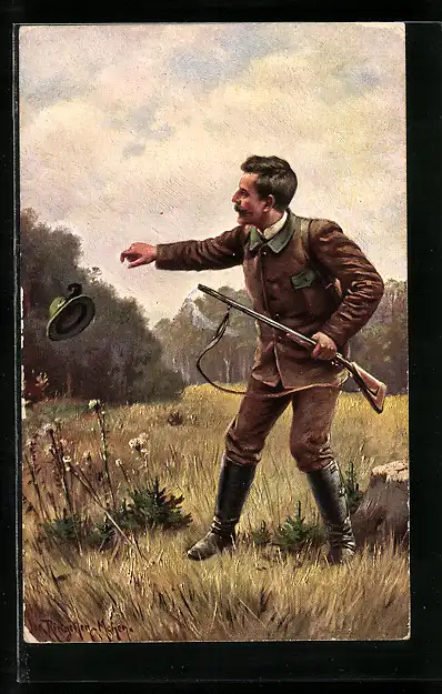 Künstler-AK Jäger wird der Hut vom Kopf geblasen