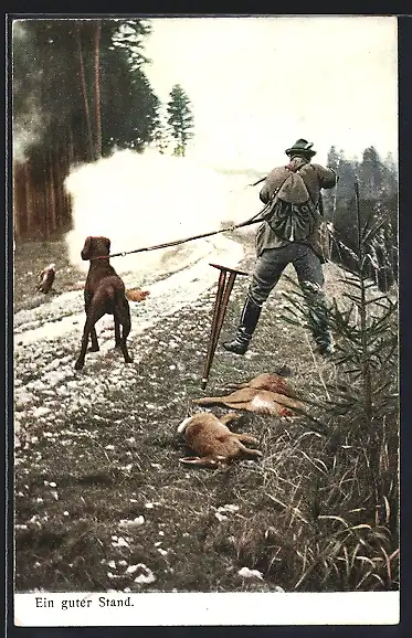 Künstler-AK Jagd, beim Erlegen mehrerer Hasen
