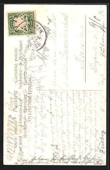 Personenbezogene Daten auf der Rückseite der Karte wurden durch blauen Textmarker unkenntlich gemacht. Die blauen Stellen sind auf die Vorderseite durchgeweicht und wirken sich negativ auf das Postkartenfoto aus