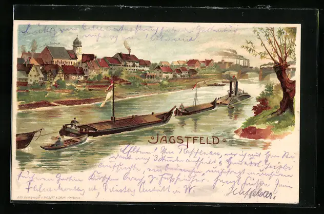 Künstler-AK Jagstfeld, Uferpartie mit Booten