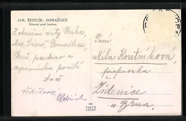 Personenbezogene Daten auf der Rückseite der Karte wurden durch blauen Textmarker unkenntlich gemacht. Die blauen Stellen sind auf die Vorderseite durchgeweicht und wirken sich negativ auf das Postkartenfoto aus