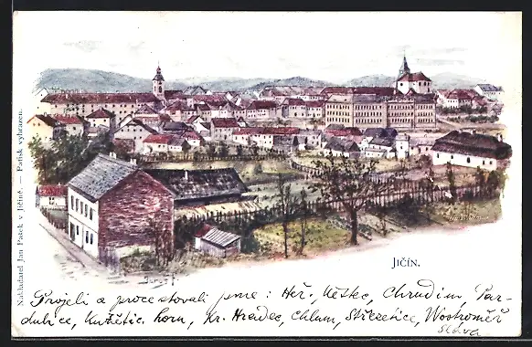 Künstler-AK Jicín, Ortsansicht gegen die Berge