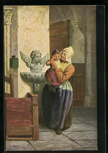 Künstler-AK Johan Georg Gerstenhauer: Mutter und Tochter in niederländischer Tracht stehen an einem Engelsbrunnen