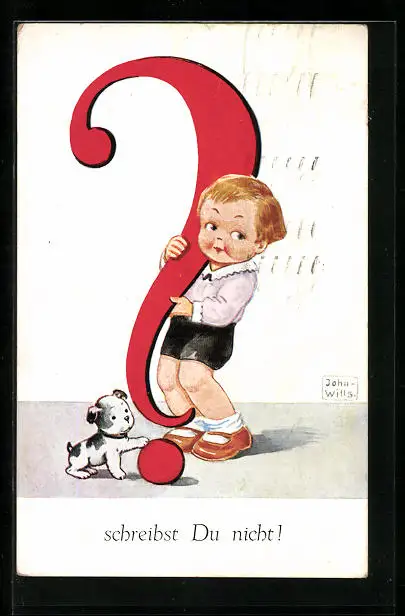 Künstler-AK John Wills: Kind mit riesigem Fragezeichen