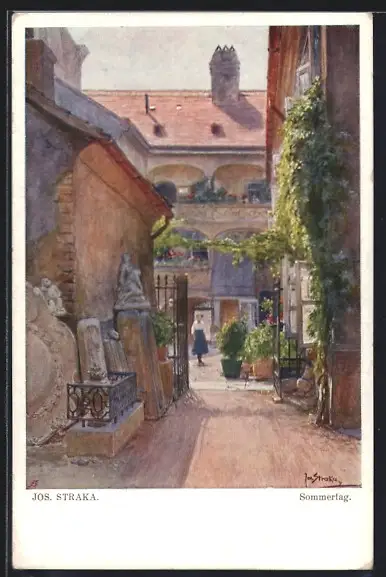 Künstler-AK Josef Straka: Sommertag, Ortspartie mit junger Frau bei den Bäumchen