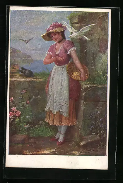 Künstler-AK Josef Süss: Dame beim Taubenfüttern