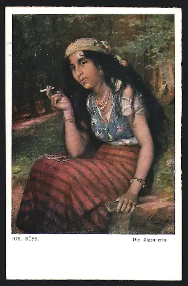 Künstler-AK Josef Süss: Zigeunerin bei einer Zigarette am Waldrand