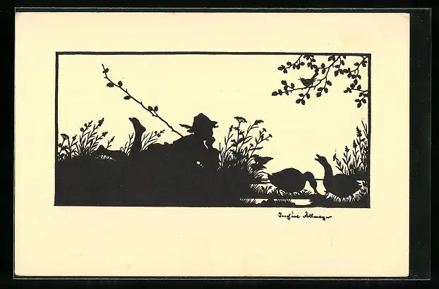 Künstler-AK Josefine Allmayer: Gänsehirte liegt im Gras