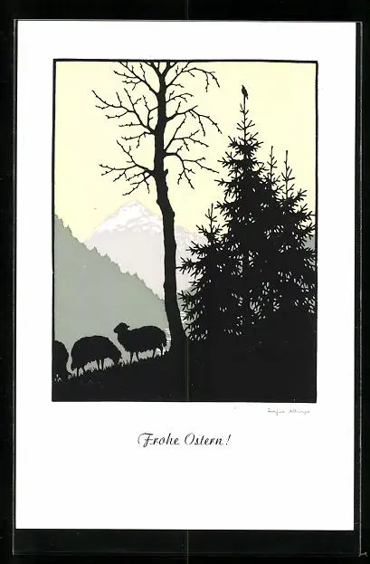 Künstler-AK Josefine Allmayer: Scherenschnitt, Schafe in den Bergen