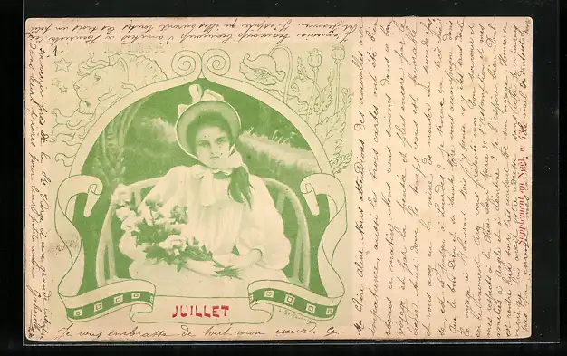 Künstler-AK Junge Dame mit Blumen, Jugendstil-Passepartout