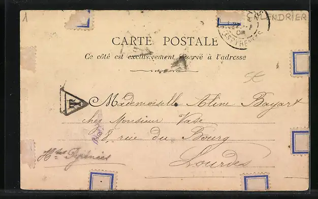 Personenbezogene Daten auf der Rückseite der Karte wurden durch blauen Textmarker unkenntlich gemacht. Die blauen Stellen sind auf die Vorderseite durchgeweicht und wirken sich negativ auf das Postkartenfoto aus