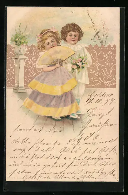 Künstler-AK Junge Dame mit Fächer in Begleitung