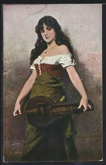 Künstler-AK Junge Frau mit einer Leier - Saiteninstrument
