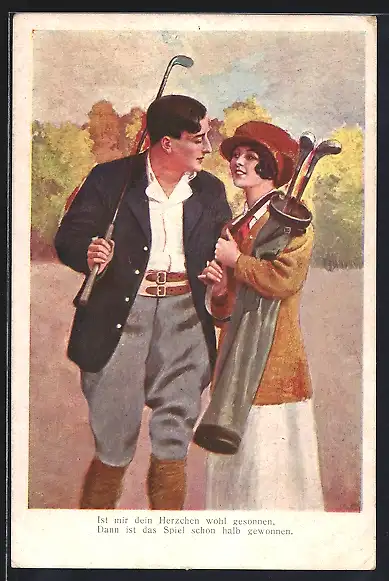 Künstler-AK Junge Frau mit ihrem Liebsten beim Golfen