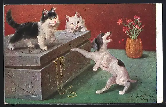 Künstler-AK Junge Kätzchen beim Spielen mit einem Hundewelpen